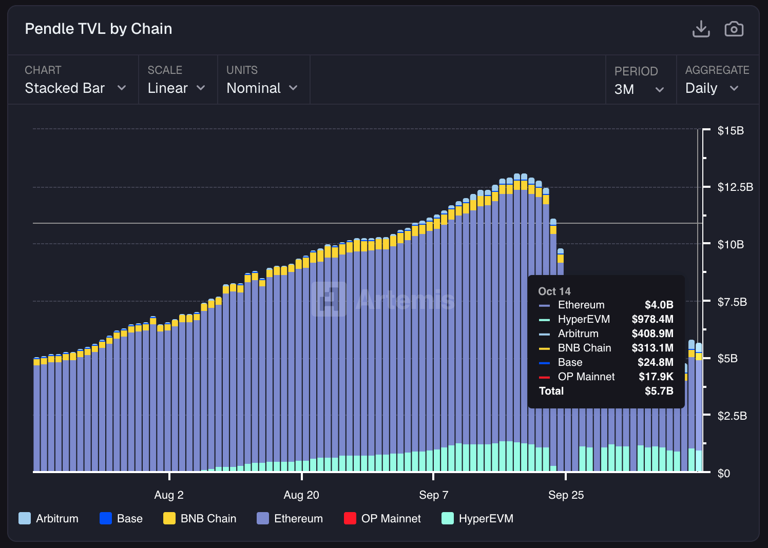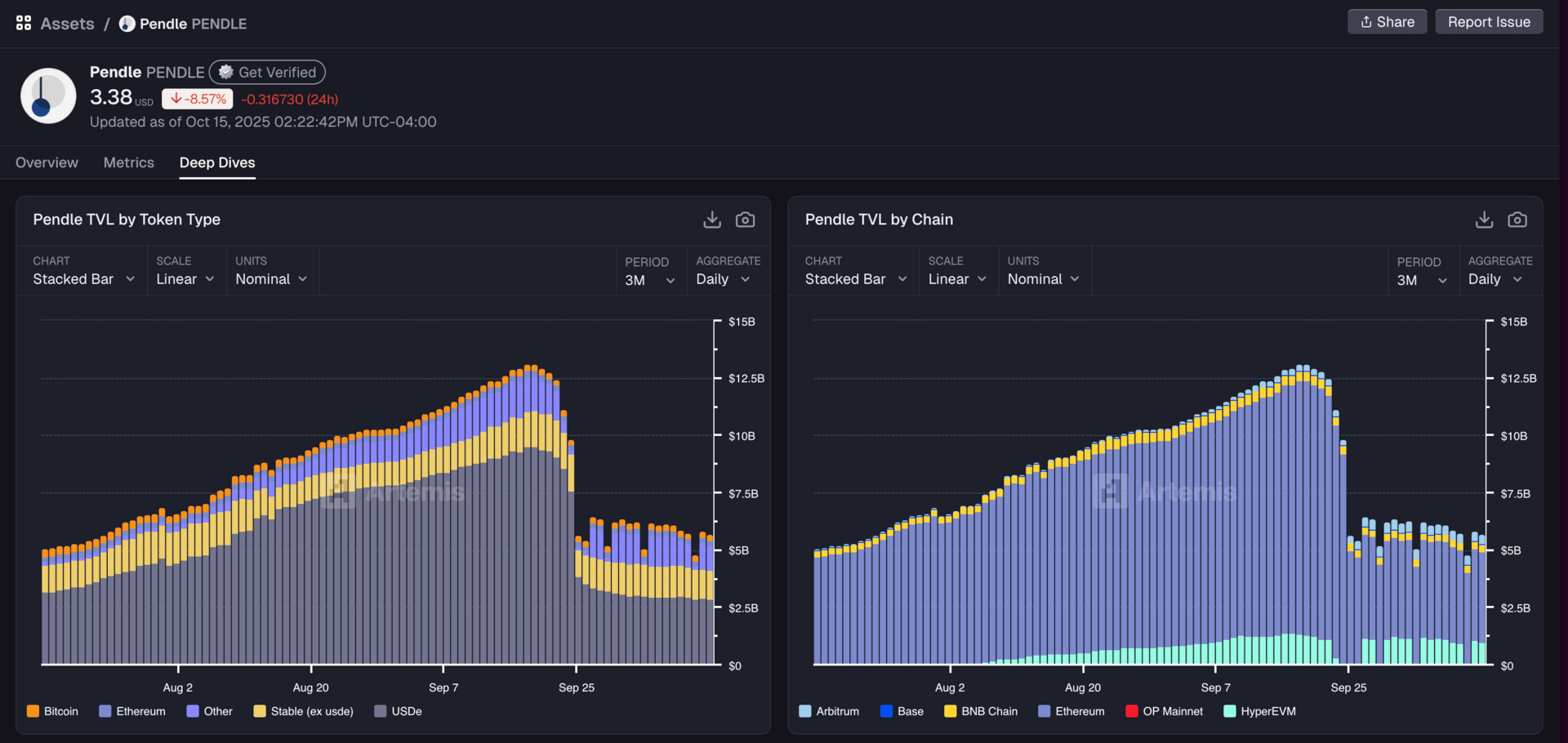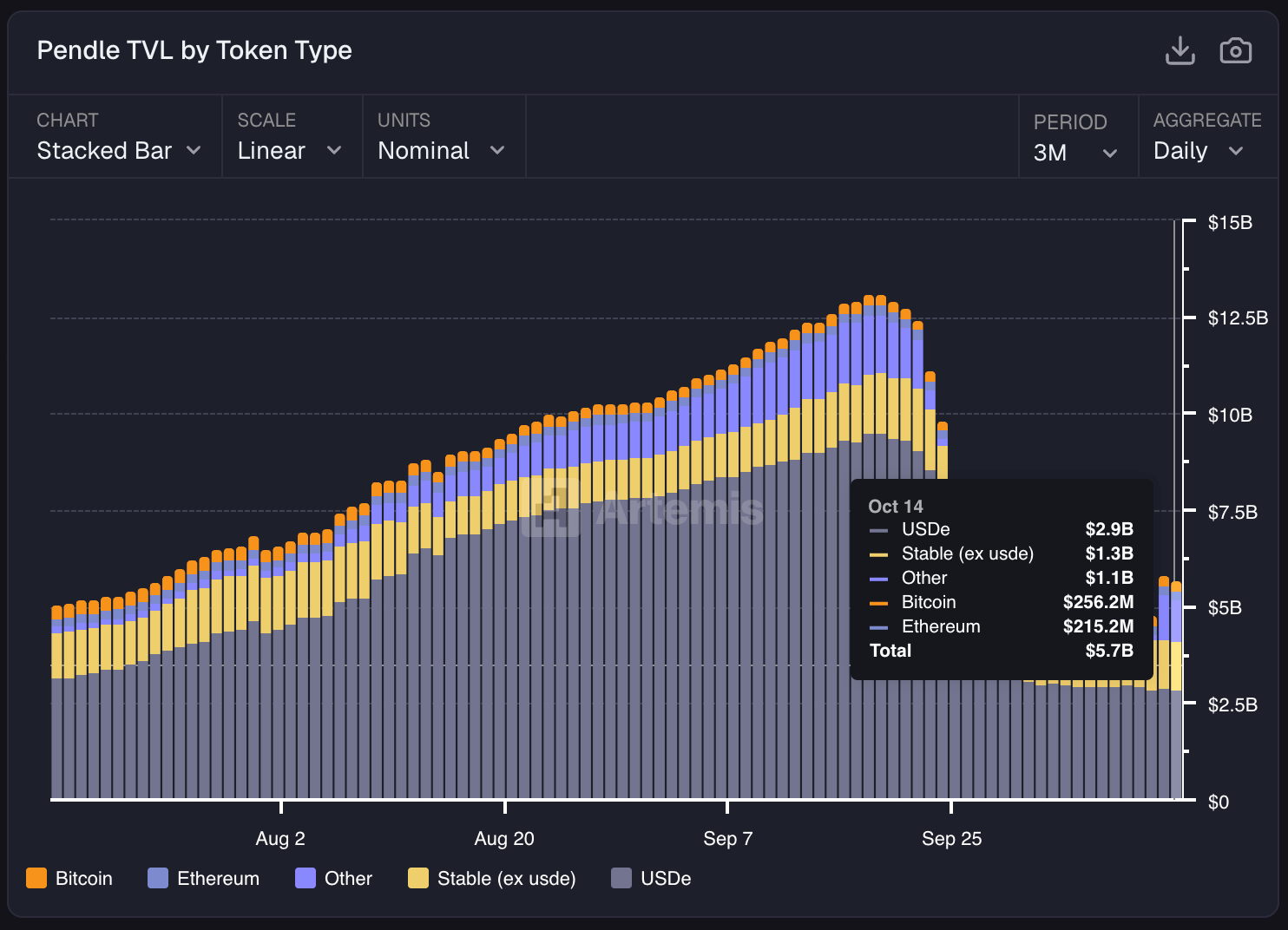 Pendle’s TVL peaked above $13B in September 2025, with the majority coming from USDe (~$8B), followed by other stables, BTC, and ETH.