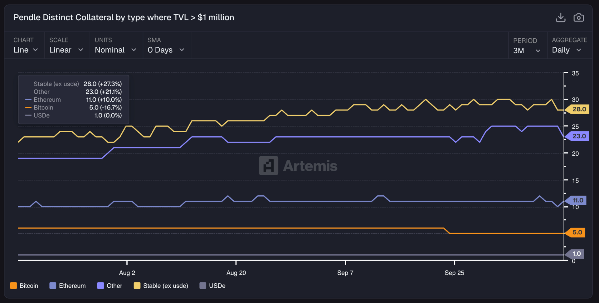 Pendle’s collateral base has expanded meaningfully, with stablecoins leading the way at 28 distinct collateral types (+27%), reflecting their role as the backbone of the protocol’s growth. While Ethereum (11 types, +10%) and other assets (23 types, +21%) continue to provide diversification. This diversification shows Pendle evolving into a multi-asset yield marketplace that can flexibly capture new narratives while being anchored by the stability of stables.