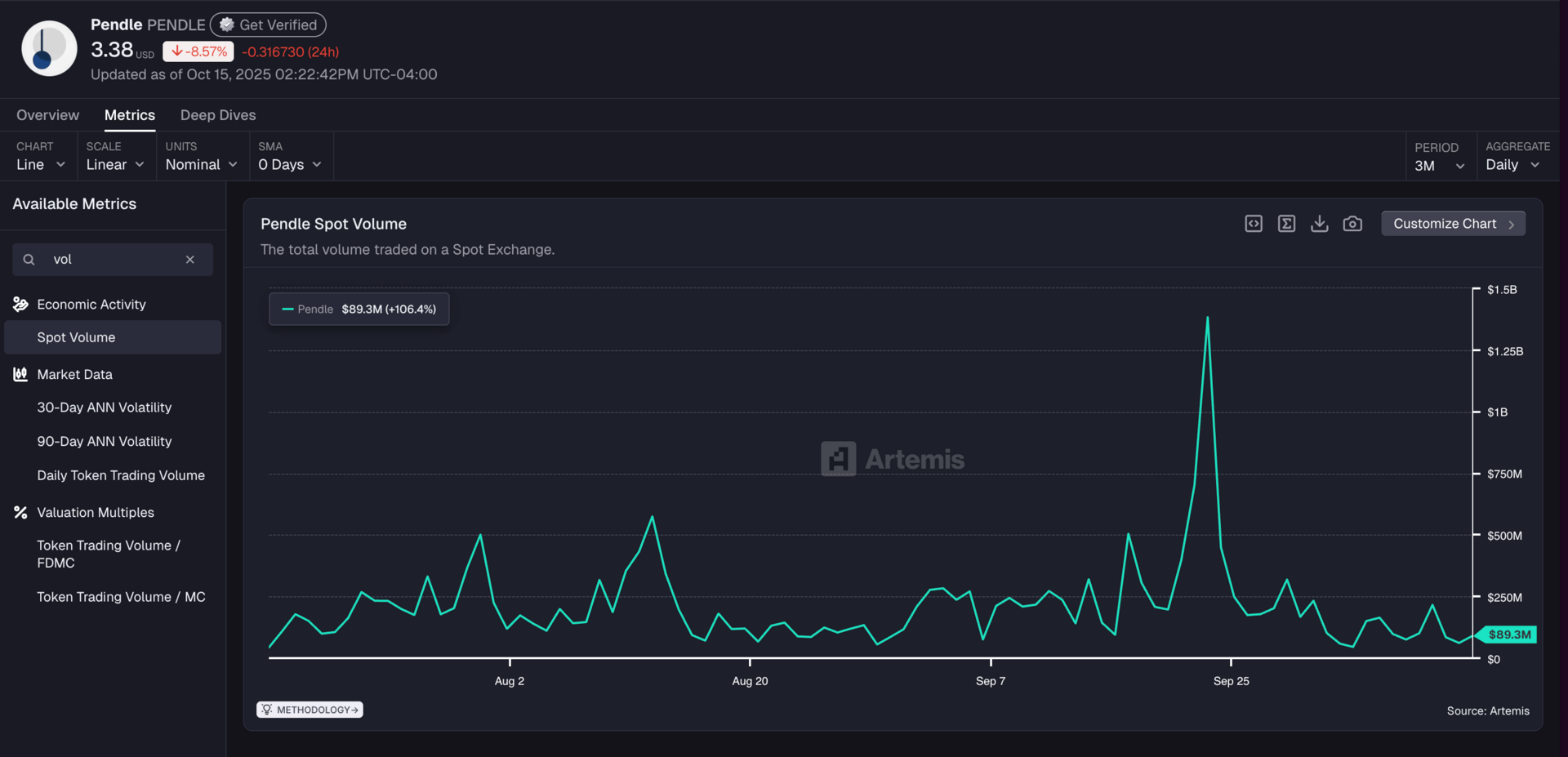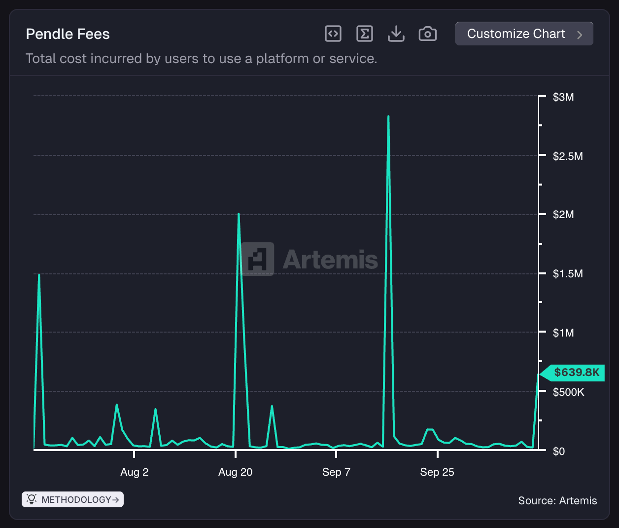 Pendle’s liquidity mix is highly narrative-driven. Initially ETH-heavy (LST/LRT days), it pivoted to BTCFi, and now 78%+ is in stablecoins. This shows huge demand for predictable, sustainable yield. The spike and correction in Sept ’25 reflects a large maturity cycle unwind.